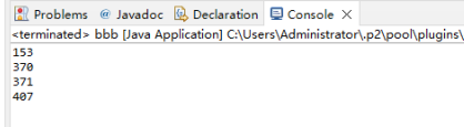 package aaa; import java.util.Scanner; public class bbb { public static void main(String[] args) { // TODO Auto-generated method stub int n=100; while(n<1000) { int a=n/100,b=n%100/10,c=n%100%10; if(a*a*a+b*b*b+c*c*c==n) System.out.println(""+n); n++; } } }
