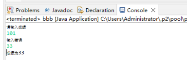 package aaa; import java.util.Scanner; public class bbb { public static void main(String[] args) { // TODO Auto-generated method stub System.out.println("请输入成绩"); Scanner in=new Scanner(System.in); int n=in.nextInt(); while(n<0||n>100) { System.out.println("输入错误"); n=in.nextInt(); } System.out.println("成绩为"+n); } }