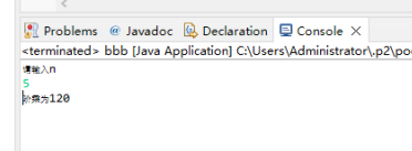 package aaa; import java.util.Scanner; public class bbb { public static void main(String[] args) { // TODO Auto-generated method stub int a=1,b=1; System.out.println("请输入n"); Scanner in=new Scanner(System.in); int n=in.nextInt(); do { b=b*a; a++; }while(a<=n); System.out.println("阶乘为"+b); } }