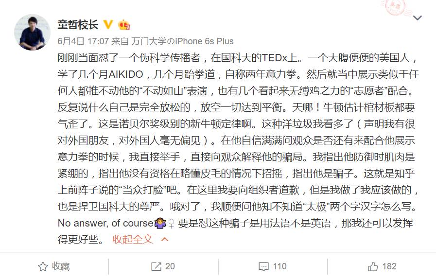 今年6月,童哲出席TEDx,在另一位演讲者展示自己所谓“不动如山”的意力拳时,当面指出其是骗子。他发微博说“刚刚当面怼了一个伪科学传播者”,随后就有人在知乎提问“如何看待童哲在 TEDxYanqihu 上指出 Hawkeye 传播伪科学?”。