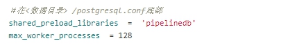 安装完成后,我们需要设置一下postgresql的配置文件postgresql.conf,搜索找到shared_preload_libraries参数设置为pipelinedb;搜索找到max_worker_processes的值可以设置为128,以使PipelineDB工作进程 具有足够的容量。