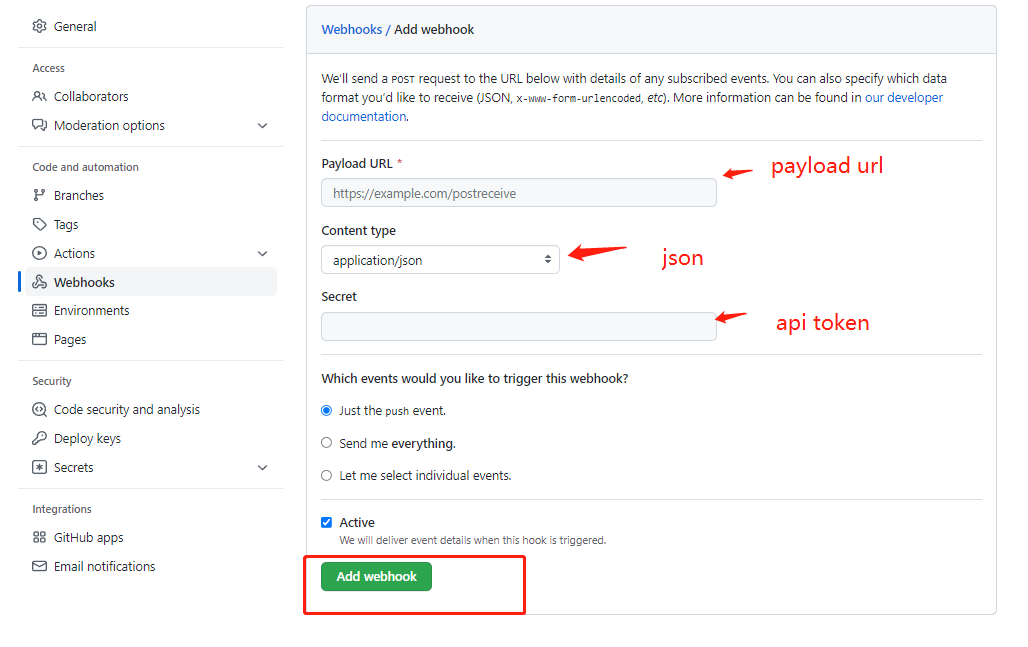 复制token,现在我们就拿到了两个payload url和token;打开github进入我们的项目。点击setting->webhooks->add webhook->