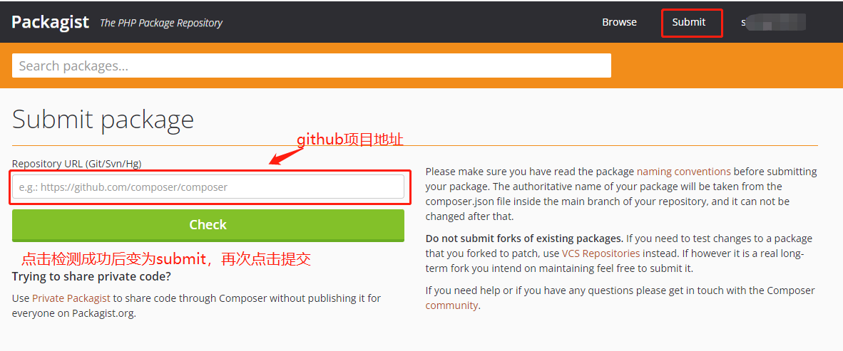 粘贴刚才复制的项目地址,点击check,检测成功后,点击submit,注意是点了两次。下面界面是提交成功了。