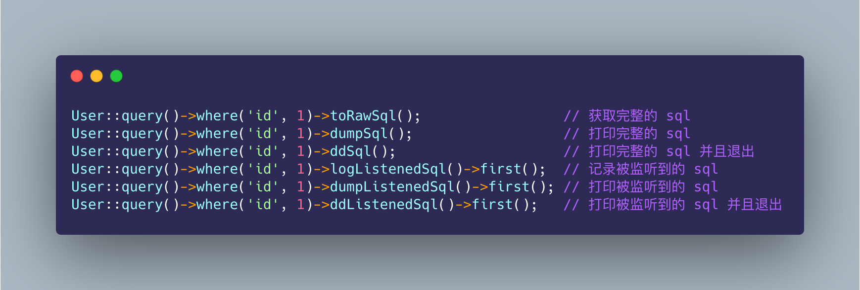 User::query()->where('id', 1)->ddSql(); // 新增方法 `ddSql` 的打印结果