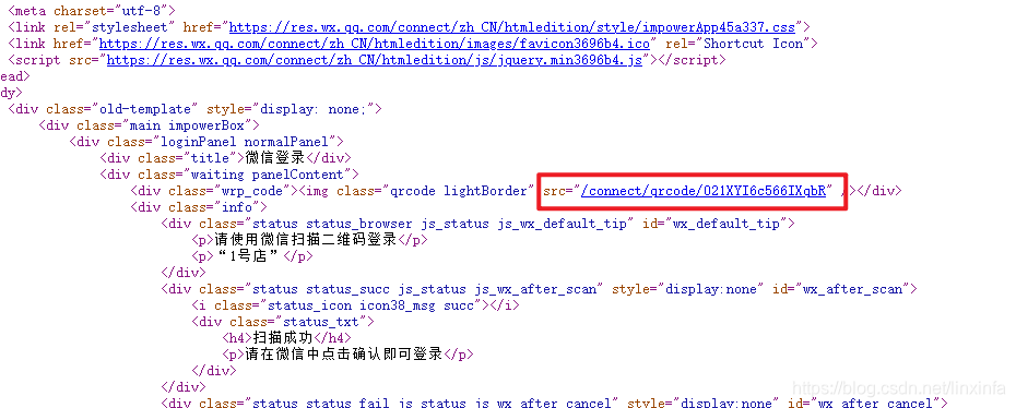 然后,就可以构造出二维码的url了,就是前面拼接上域名https://open.weixin.qq.com/,即https://open.weixin.qq.com/connect/qrcode/021XYI6c566IXqbR