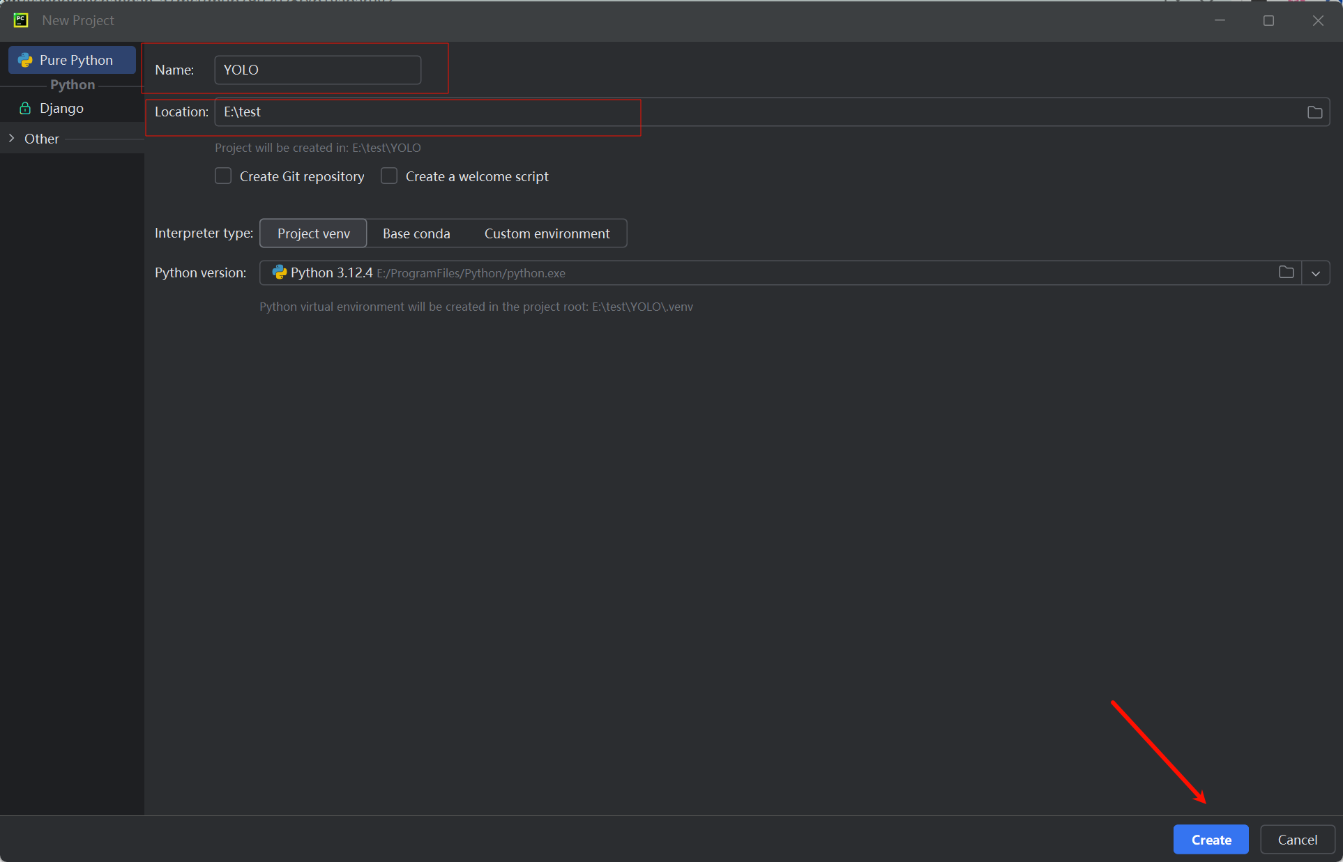 选择好目录并输入项目名称YOLO点击Create完成项目创建。