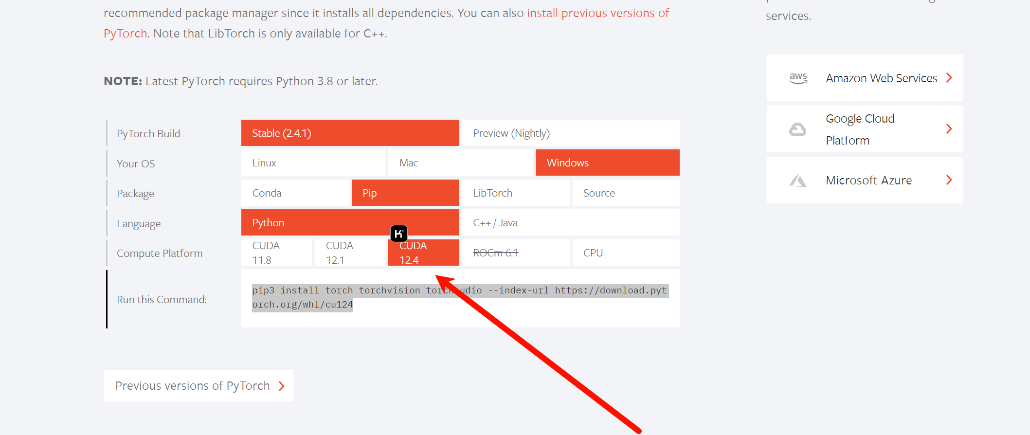 比如我的cuda最高为12.6,就向下兼容选择12.4。然后复制安装命令: