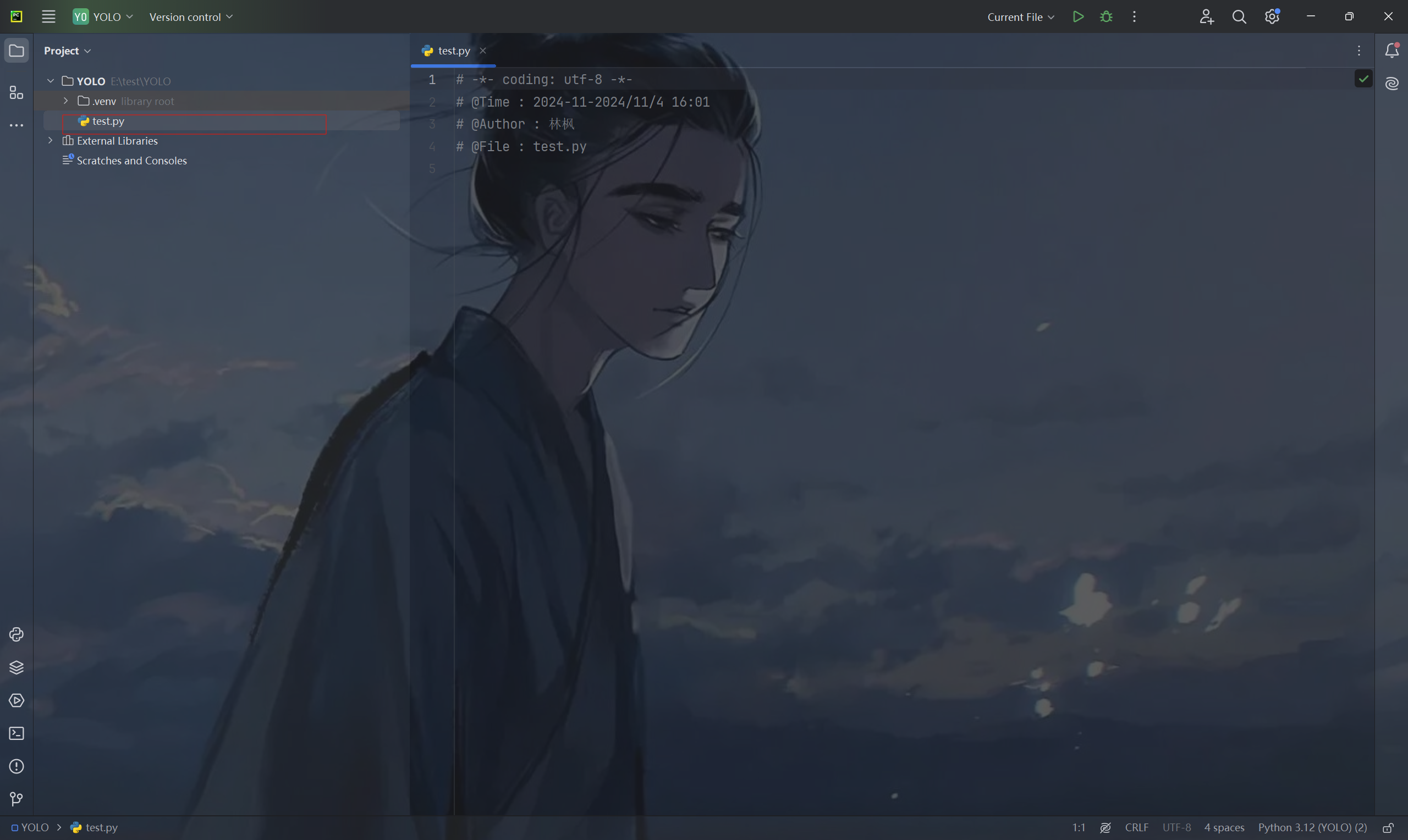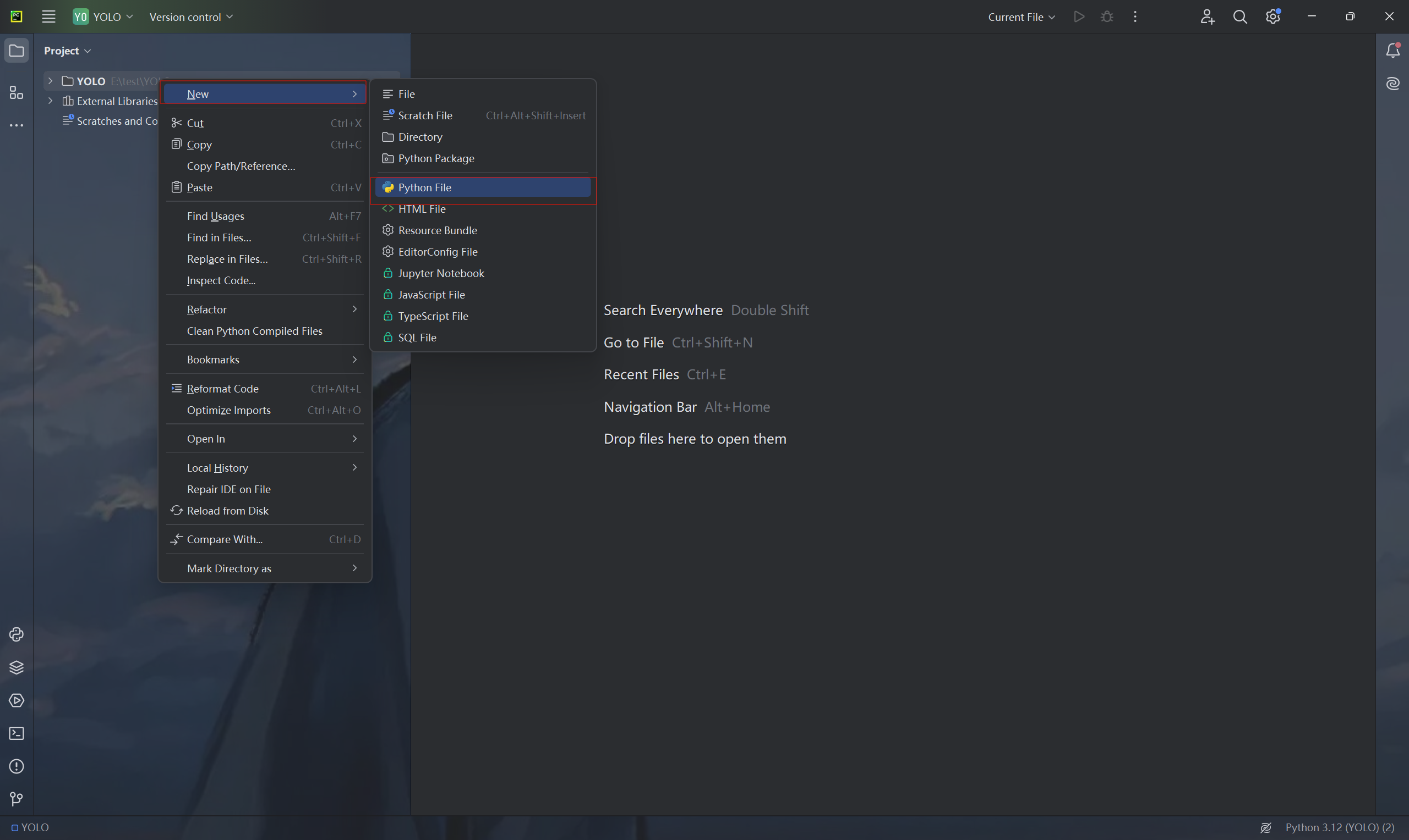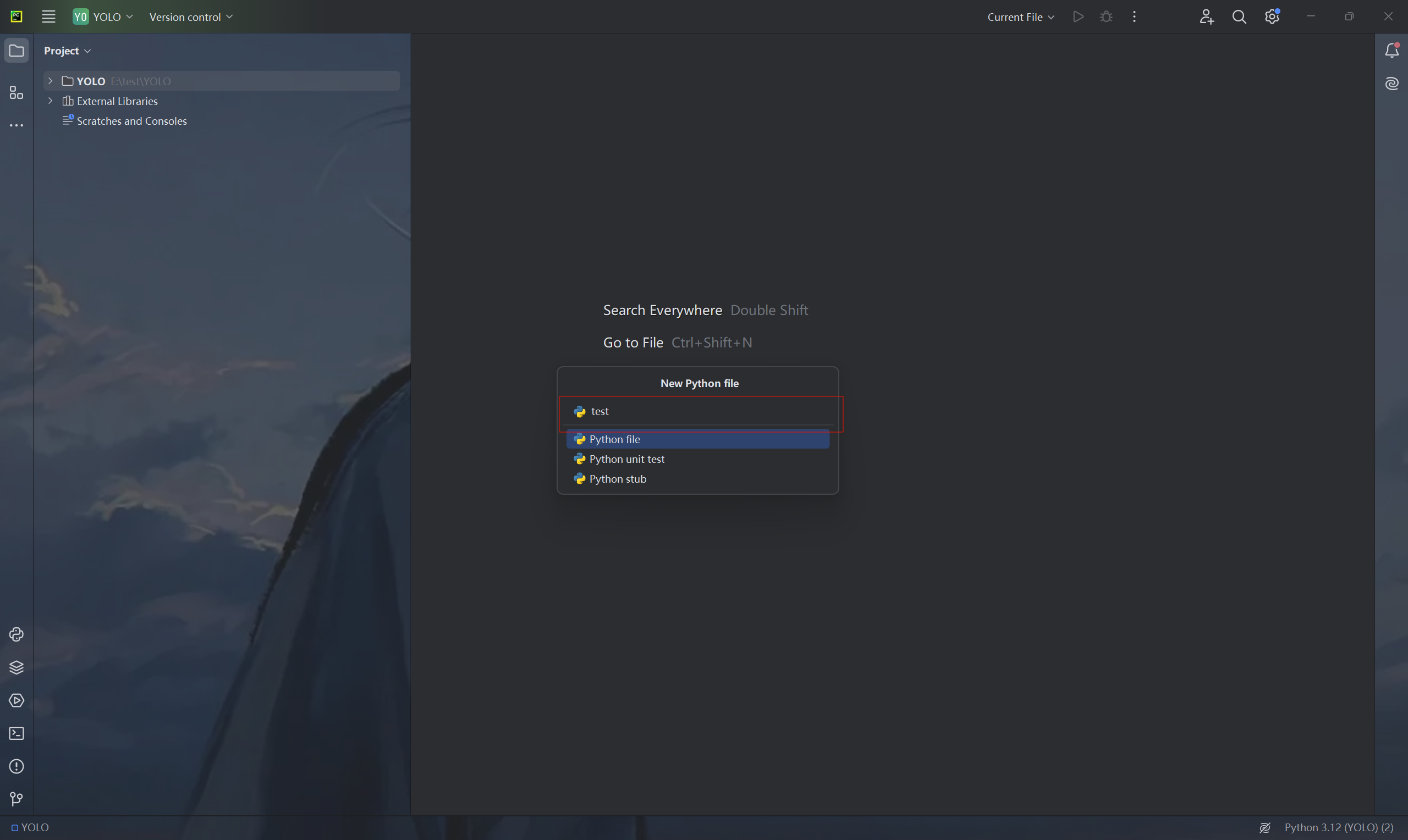 右击YOLO文件夹创建test.py文件
