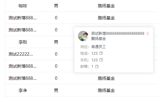 1 <el-table-column label="姓名" prop="realName" width="200"> 2 <template #default="scope"> 3 <el-popover 4 placement="top" 5 trigger="hover" 6 :width="300" 7 popper-class="custom-popover" 8 > 9 <!-- Popover 内容 --> 10 <template #default> 11 <div> 12 <p>岗位:{{ scope.row.position }}</p> 13 <p>电话:{{ scope.row.tel }}</p> 14 <p>手机:{{ scope.row.phone }}</p> 15 <p>邮箱:{{ scope.row.email }}</p> 16 </div> 17 </template> 18 19 <!-- 触发区域(注意不要被裁剪)--> 20 <div 21 class="trigger-text" 22 @mouseenter="checkOverflow($event, scope.row)" 23 > 24 <span v-if="scope.row._showPopover" class="ellipsis">{{ scope.row.realName }}</span> 25 <span v-else>{{ scope.row.realName }}</span> 26 </div> 27 </el-popover> 28 </template> 29 </el-table-column>