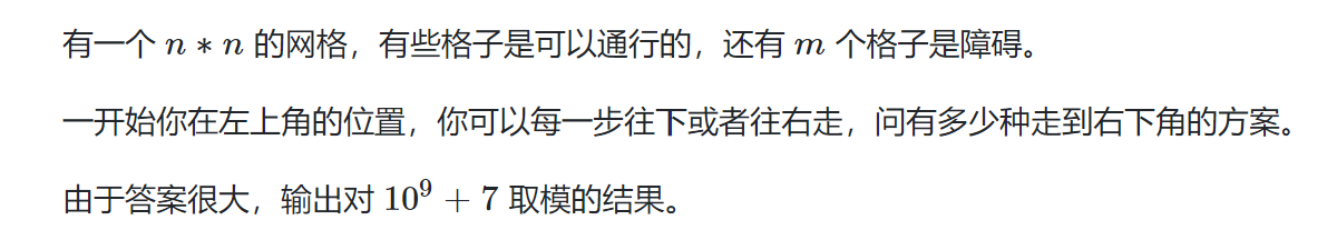 定义dp[i]为从(1,1)到(xi,yi)且不经过之前所有(xj<xi&&yj<yi)所有障碍的路径数。