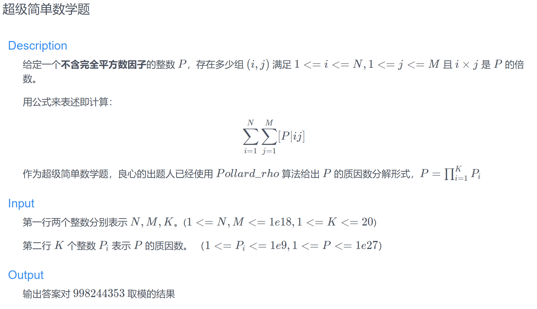 所以,根据容斥,可以转化成这么一个式子:\(\sum_{d|P}\mu(d)\sum^{N}_{i}\sum^{M}_{j}[gcd(d,i)==1][gcd(d,j)==1] \)。