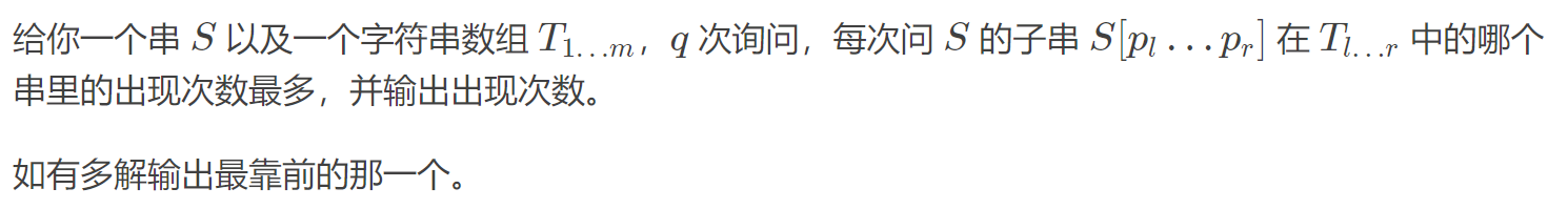 思路是十分板的,先把S串插入到SAM中,记录下S串每个前缀对应的节点pos;之后再插入m个T串,插入的时候,还要更新last节点的线段树。(为什么先把S插入到SAM中,后面再插T串不会影响之前记录的pos数组呢?纵观insert函数,只有节点分裂会影响一个节点,但因为S串每个前缀在对应的状态点中都是长度最大的,即使分裂,也是保存在q节点之后,线段树没有发生变化,所以我们可以先插入S,再插入Ti。)。