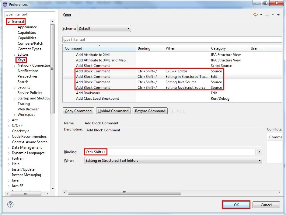 Eclipse工具栏上选择Window -> Preferences -> General -> Keys,进入如下界面:
