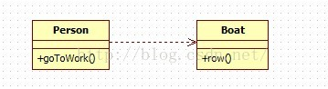 含义:是类与类之间的连接,表示一个类依赖于另外一个类的定义;依赖关系仅仅描述了类与类之间的一种使用与被使用的关系;