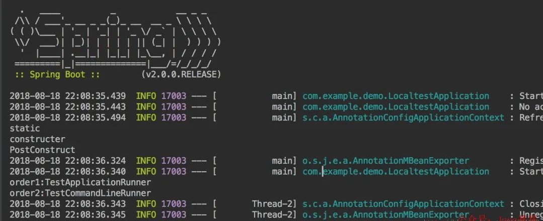 因此,加载顺序为static>constructer>@PostConstruct>CommandLineRunner和ApplicationRunner.