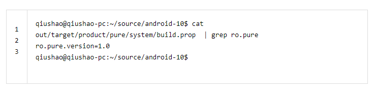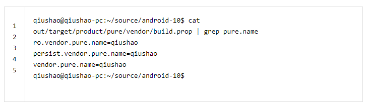 因此,如果我们一定要把属性加到 /system/build.prop 的话,还需要在 device/qiushao/pure/BoardConfig.mk 添加以下配置才可以: