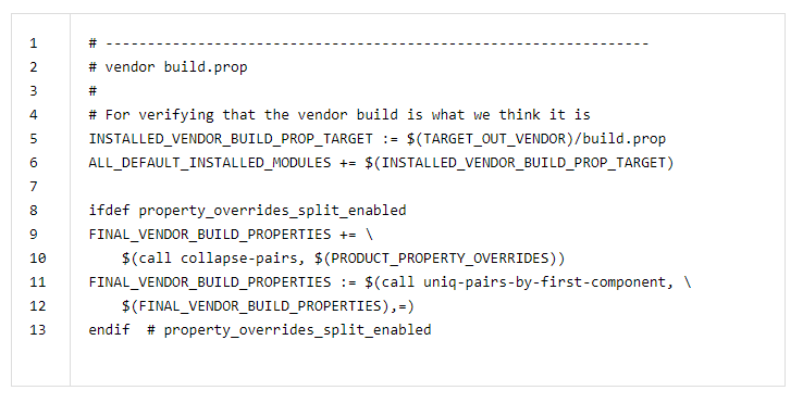 ifdef TARGET_SYSTEM_PROP system_prop_file := $(TARGET_SYSTEM_PROP) $(info TARGET_SYSTEM_PROP = $(TARGET_SYSTEM_PROP)) else system_prop_file := $(wildcard $(TARGET_DEVCIE_DIR)/system.prop) endif