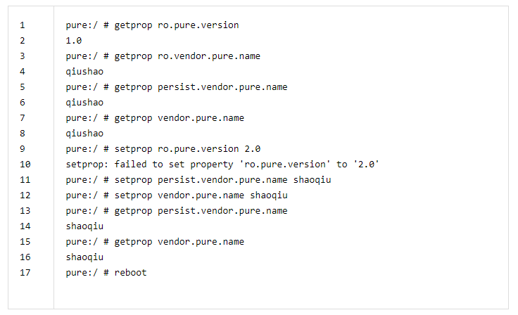 然后我们尝试用 setprop 命令改写属性的值,发现 ro 前缀的属性改写失败了,其他属性可以改写成功。