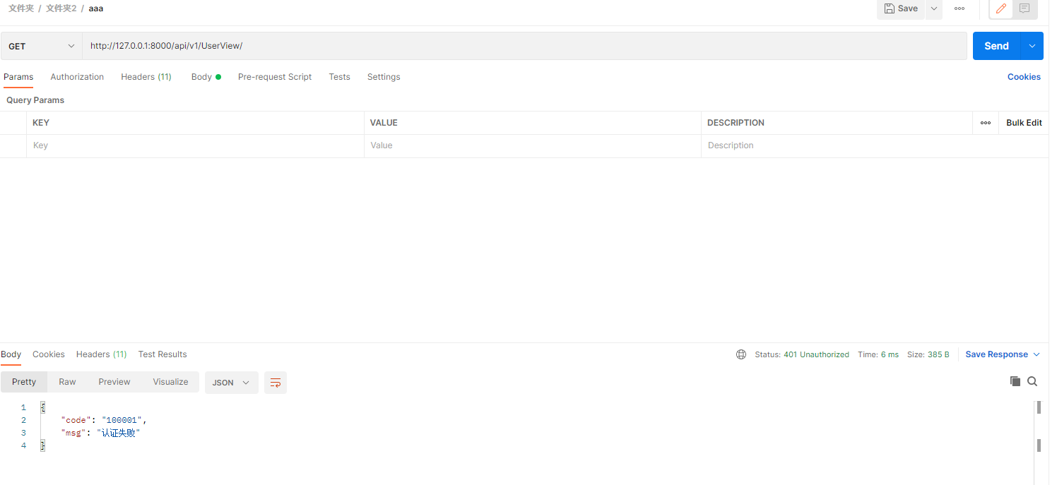 5、获取token信息后,再次访问之前的UserView接口,不加token时,因为有了全局认证配置,返回认证失败