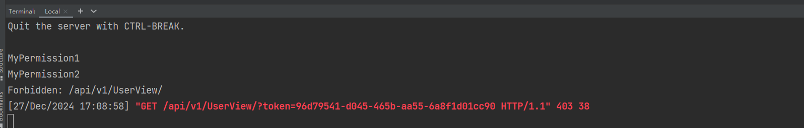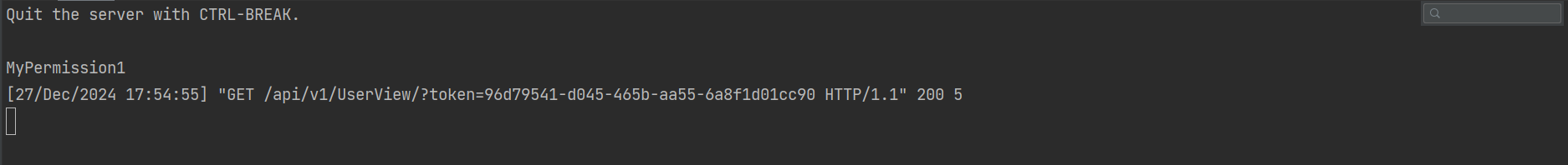 7.1.3,从控制台可以看出,只输出了MyPermission1和MyPermission2,MyPermission3并没有触发,因此,权限组件默认情况下:当所有的权限类全部为True时,才通过权限