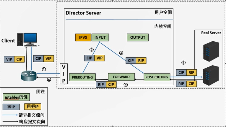 3.真实服务器收到请求时,需要将响应报文传送给客户机,就以RIP作为源IP,CIP作为目标IP,传送给负载调度器。