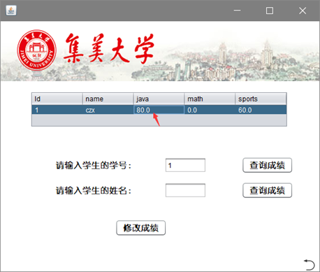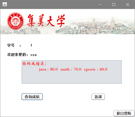 - (4)学生用户查询成绩界面:学生通过输入学号便可以查出自己的成绩