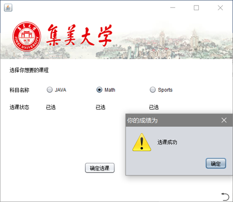 - (3)学生选课界面:学生通过点击所要选科目的按钮,来选择所要选的科目,一旦选上,则会在下面显示已经选择