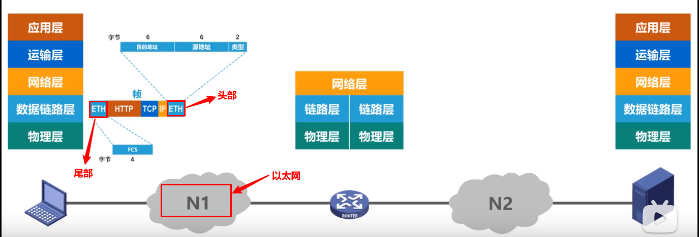- 数据链路层给IP数据报添加一个首部和一个尾部,使之成为帧,假设网络N1是以太网。