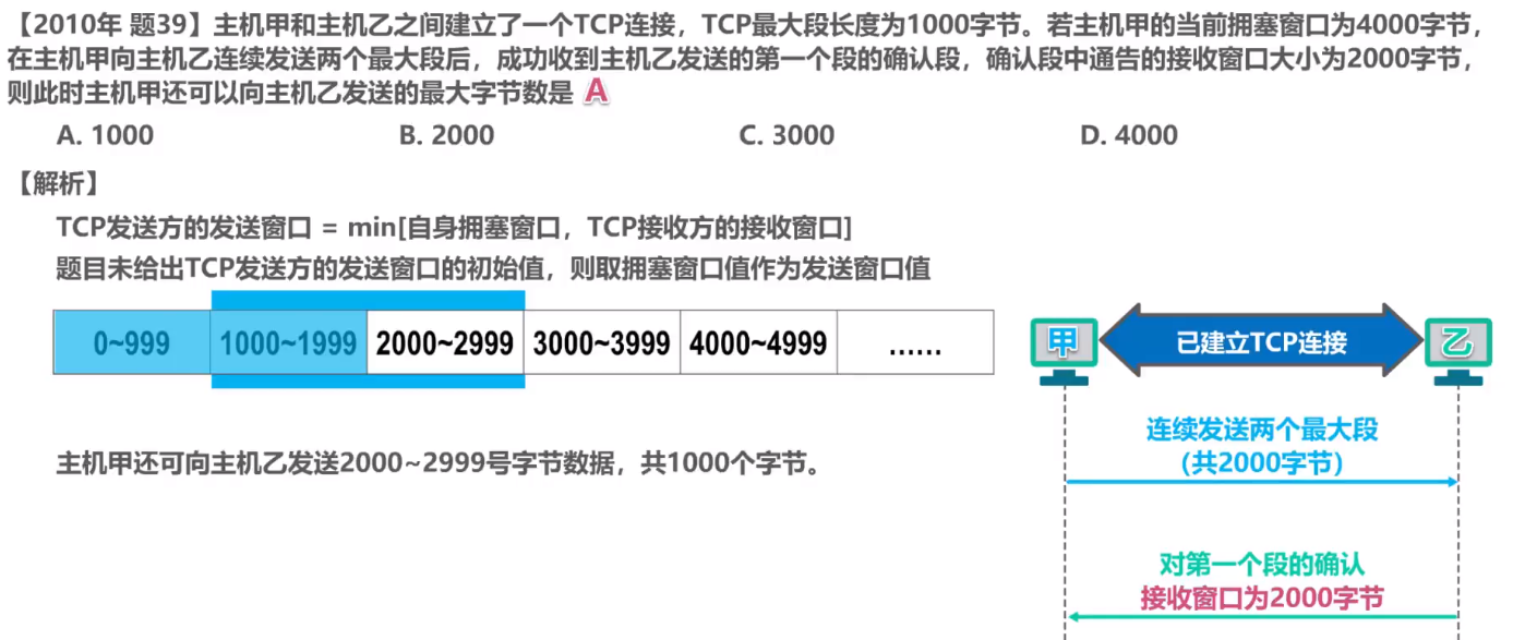 主机甲的发送窗口为4000字节,主机甲向主机乙连续发送两个最大段,共2000字节。也就是将发送窗口内序号0- -1999的字节数据发送出去,主机乙给主机甲发送针对第一段的确认,并在该确认中给出自己当前的接收窗口大小为2000字节。主机甲收到该确认后,将发送窗口向前滑动,使已发送并收到确认的第一个段的序号移出发送窗口。由于主机乙在确认中给出的自己的接收窗口大小为2000字节,因此主机甲相应地将自己的发送窗口调整为2000字节,很显然,主机甲还可以向主机乙发送2000~2999号字节数据,共1000个字节。