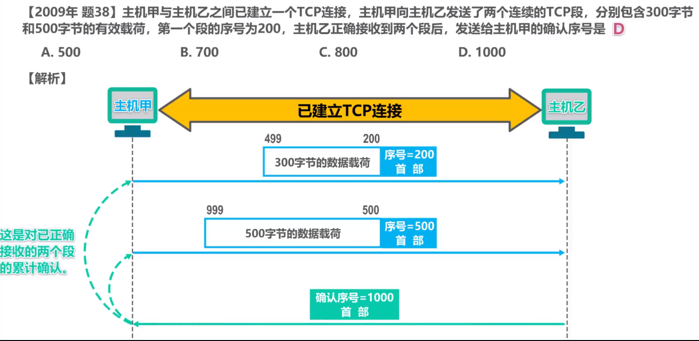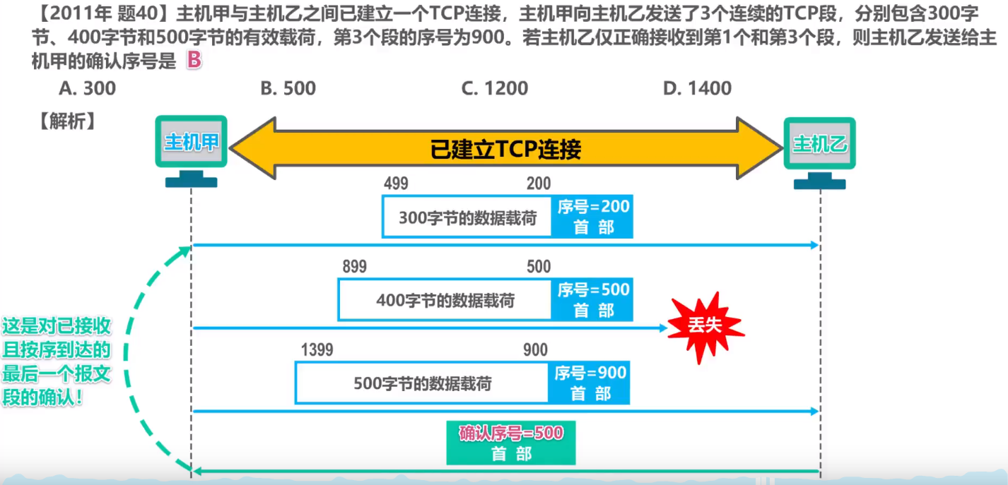 由于TCP规定只能对按序到达的最高序号进行确认,因此主机乙发送的确认报文段实际上是对第一个数据报文段的确认。由于第一个数据报文段数据载荷的最后一个字节的序号为499,因此针对该序号的确认序号应为500,表明序号499为止的全部数据已经收到了,现在希望接收500号及其后续数据。