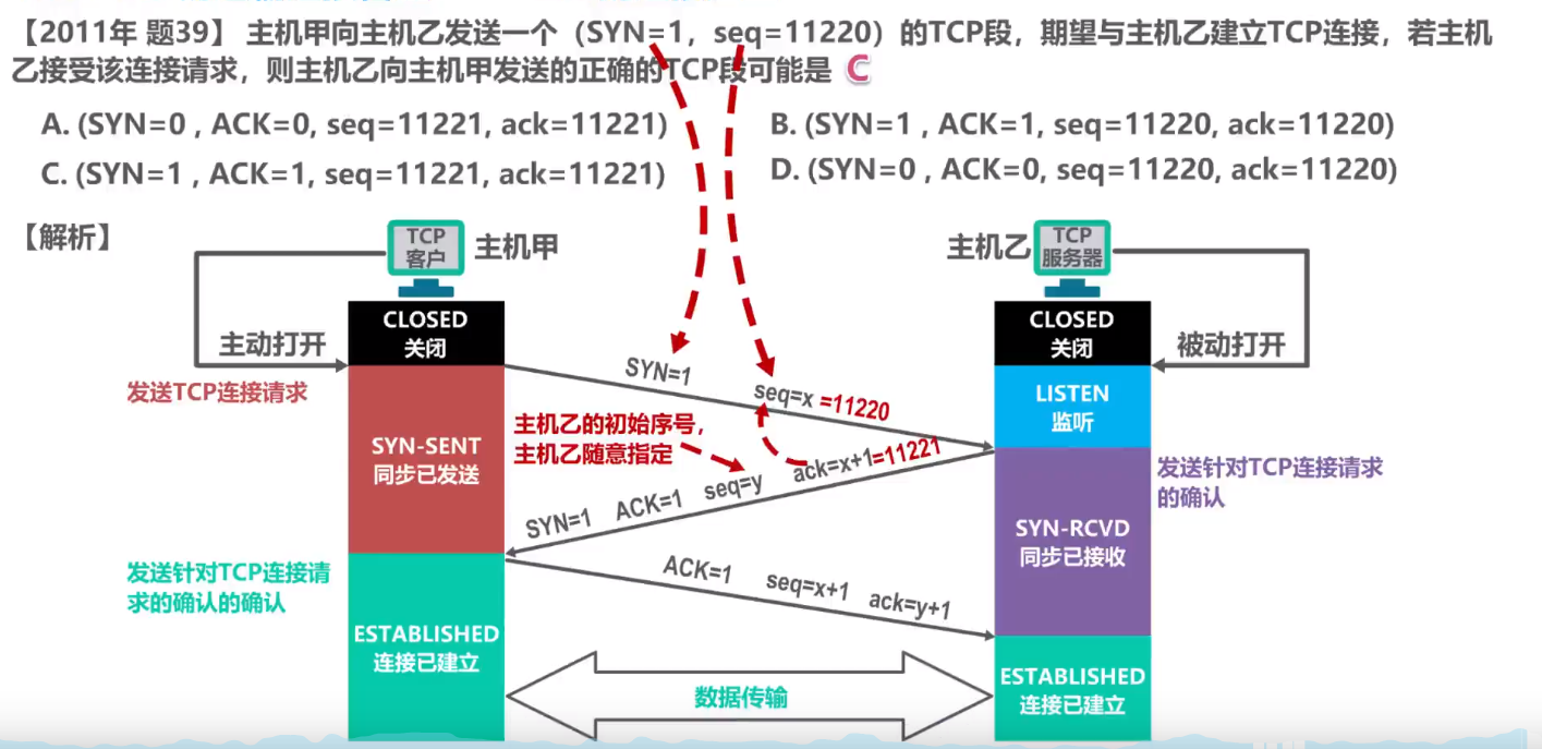 主机甲中的是TCP客户进程,主机乙中的是TCP服务器,TCP发送连接请求,其首部中的同步位SYN的值为1,序号字段seq的值就是题目所给的11220。发送的TCP连接请求确认报文段,其首部中的同步位SYN和确认位ACK的值都被设置为1,表明这是一个TCP连接请求确认报文段,确认号字段ack值是对主机甲中TCP客户进程所选择初始序号11220的确认,因此为11221。序号字段seq的值,是主机乙中TCP服务器进程所选择的初始序号,可由TCP服务器进程随意指定,与其他报文段的值无关。序号字段seq的值恰好与确认号字段ack的值同为11221。