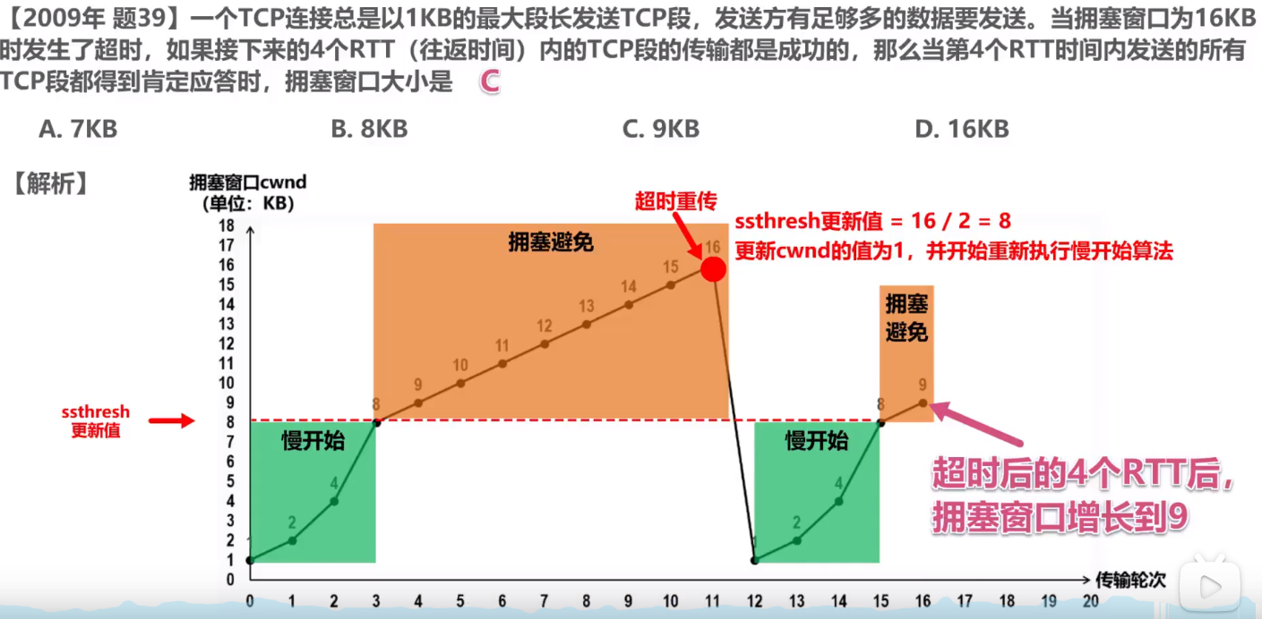 当拥塞窗口值增大到慢开始门限的初始值时,停止使用慢开始算法。转而执行拥塞避免算法,当拥塞窗口值增大到16KB时发送了超时重传。于是将慢开始门限值更新为当前拥塞窗口值的一半,并将拥塞窗口值减小为1KB,并重新开始执行慢开始算法。当拥塞窗口值增大到新的慢开始门限时,停止使用慢开始算法。转而执行拥塞避免算法,可以看到。该处就是题目所问的、在超时后的4个往返时间后,也就是在超时后的4个传输轮次结束后,拥塞窗口值增长到9KB。