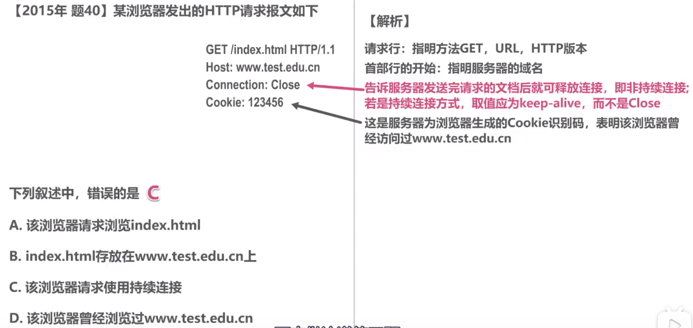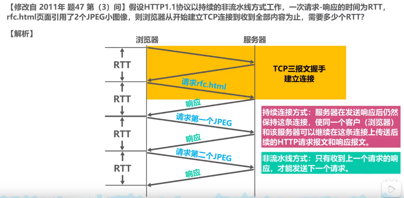 这是浏览器与服务器之间通过三报文握手进行TCP连接。在这三个报文中的最后一个报文的数据载荷部分,携带有HTTP请求报文,请求的对象是rfc.html页面。服务器收到后给客户发回包含有该对象的HTTP响应报文。由于rfc.html页面中的引用另外2个JPEG小图像,则浏览器会继续依次分别请求这两个对象。很显然,浏览器从开始建立TCP连接到收到全部内容为止,需要4个RTT。