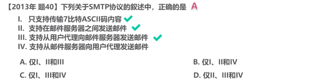 邮件服务器之间发送邮件,采用的是SMTP协议,因此,叙述ll正确。用户代理给邮件服务器发送邮件也使用SMTP协议。因此,叙述III也正确。用户代理从邮件服务器读取邮件时,使用的是POP3协议,还可以使用功能更强的IMAP协议。因此,叙述IV错误。
