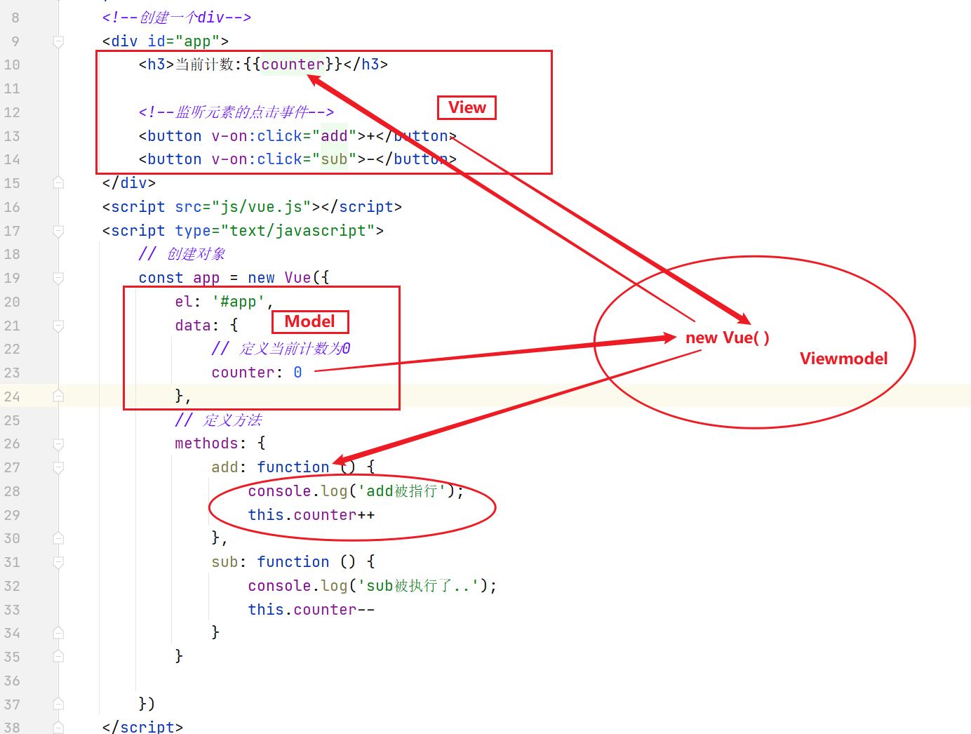 计数器中就有严格的MVVM思想,View依然是的DOM,Model就是抽离出来的obj,ViewModel就是创建的Vue对象实例。