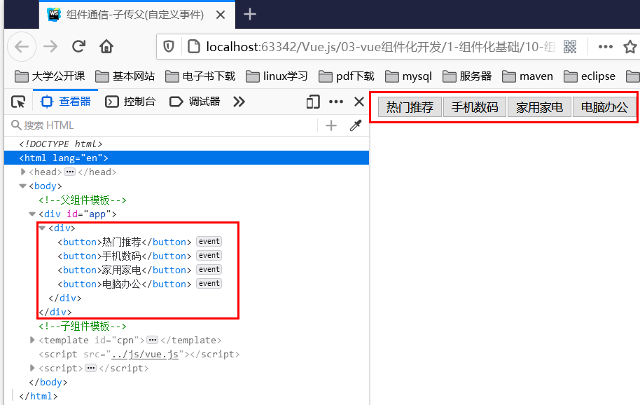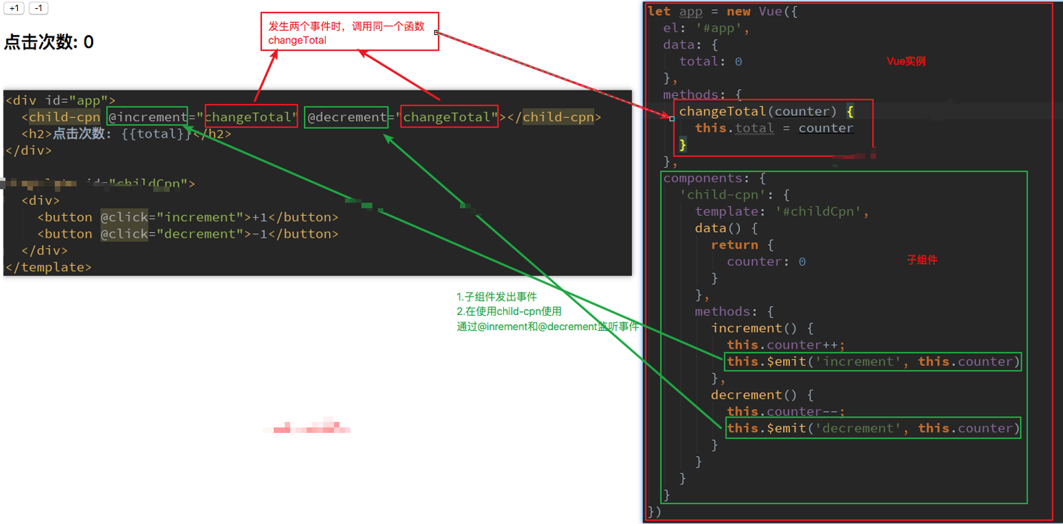 之前学习的v-on不仅仅可以用于监听DOM事件,也可以用于组件间的自定义事件。