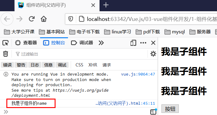 - 其次,通过this.$refs.ID就可以访问到该组件了。