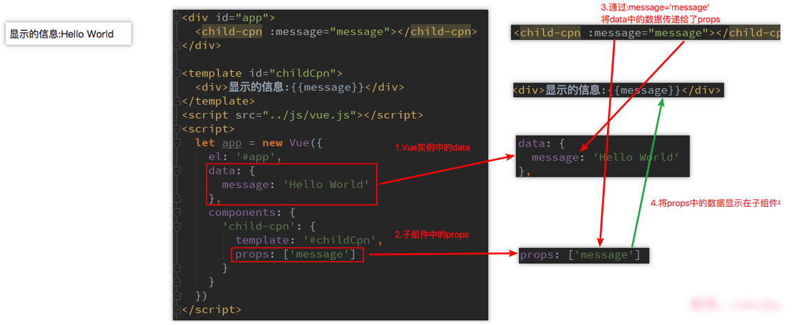 - 在组件中,使用选项props来声明需要从父级接收到的数据。