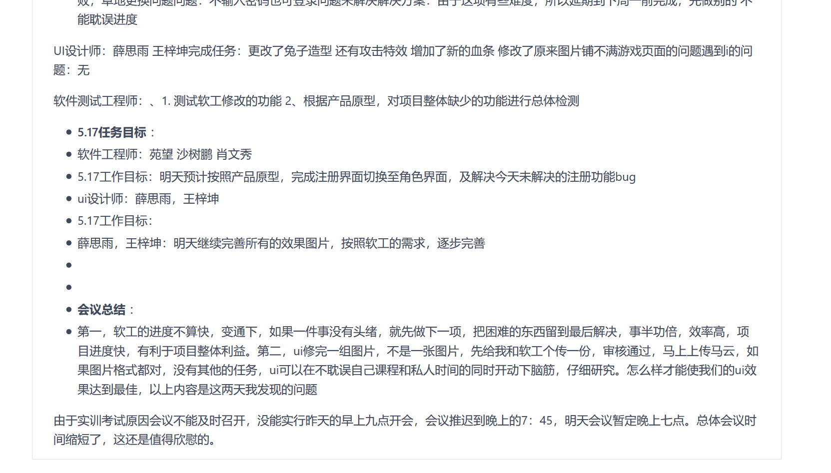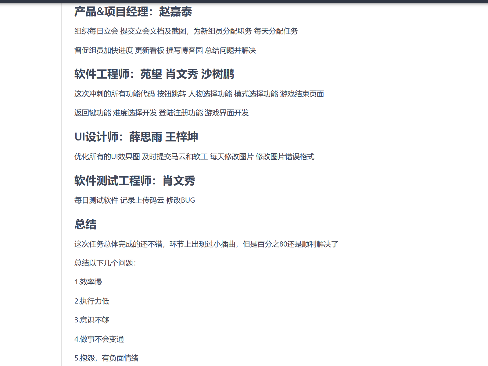 任务分工:项目/产品经理组织每日立会并写每日立会总结,每天更新甘特图,燃尽图, UI设计师收集素材,软件工程师根据需求分析每日编写代码,完成WBS图,软件测试员每日进行软件测试记录,软件测试bug并将测试的bug反馈给软件工程师和UI设计师