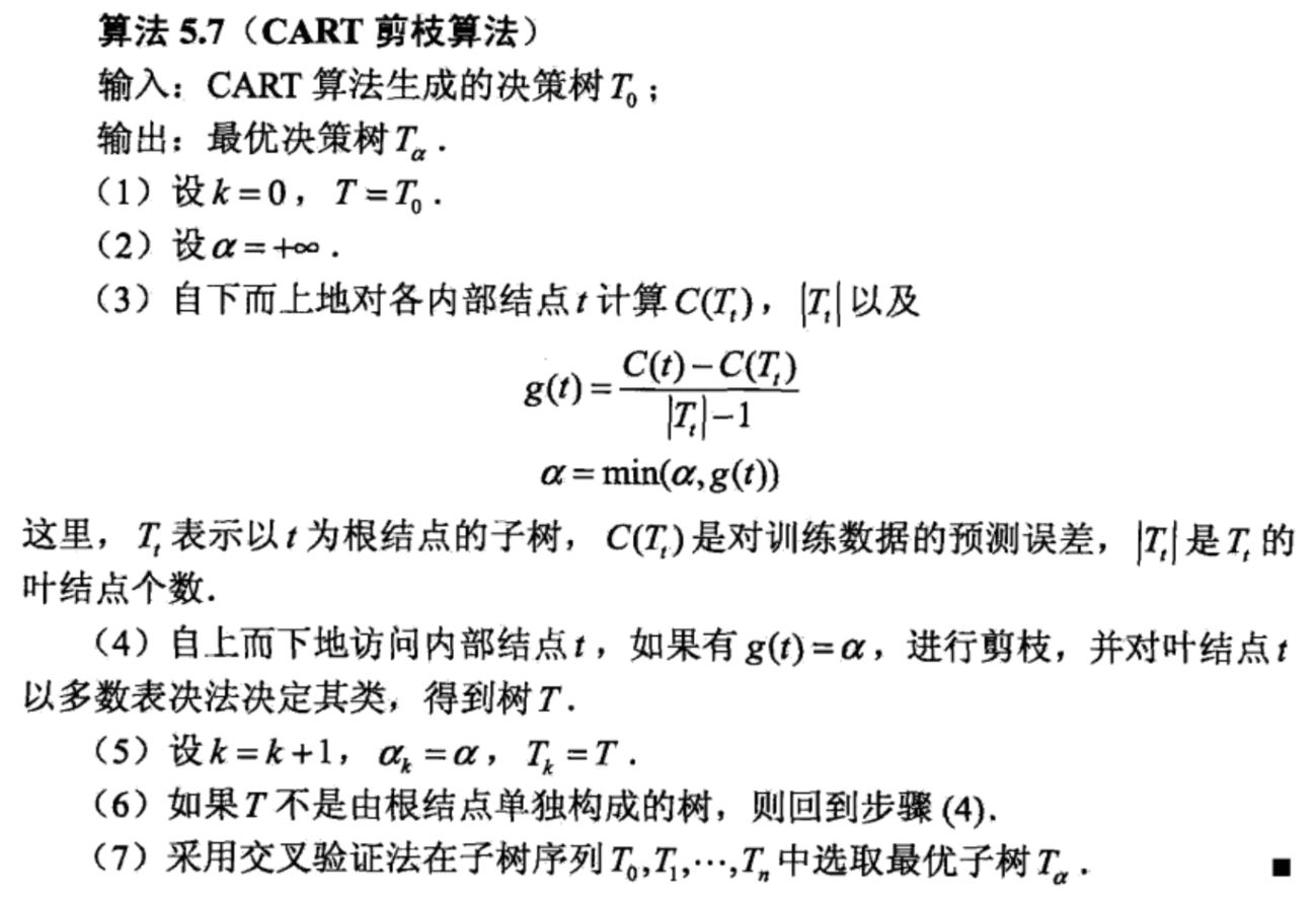 当$\alpha$极小时,$C_{\alpha}(T_{t}) < C_{\alpha}(t)$,当$\alpha$增大到一定程度时,$C_{\alpha}(T_{t}) = C_{\alpha}(t)$,此时,单结点树$t$的损失函数和根节点树$T_{t}$相同且结点更少,便对$T_{t}$进行剪枝。而此时满足等式的$\alpha$为 $\alpha= \frac{C(t) - C(T_{t})}{|T_{t}| - 1}$。