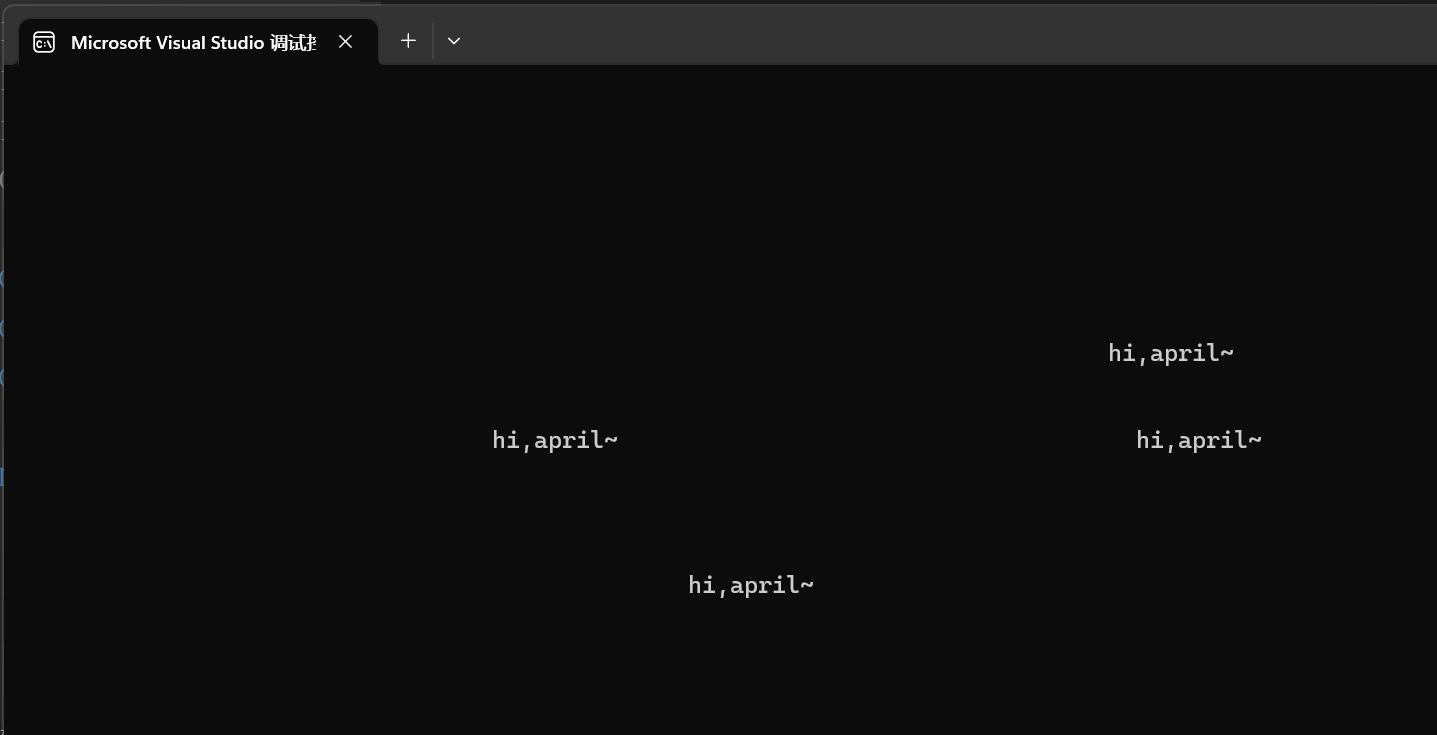 不断循环:随机生成0~25的数字作为line,随机生成0~80的数字作为col,打印line-1行空行,打印col-1列空格后,在第line行,第col列输出hi,April~的字符串。即随机分布hi,April~