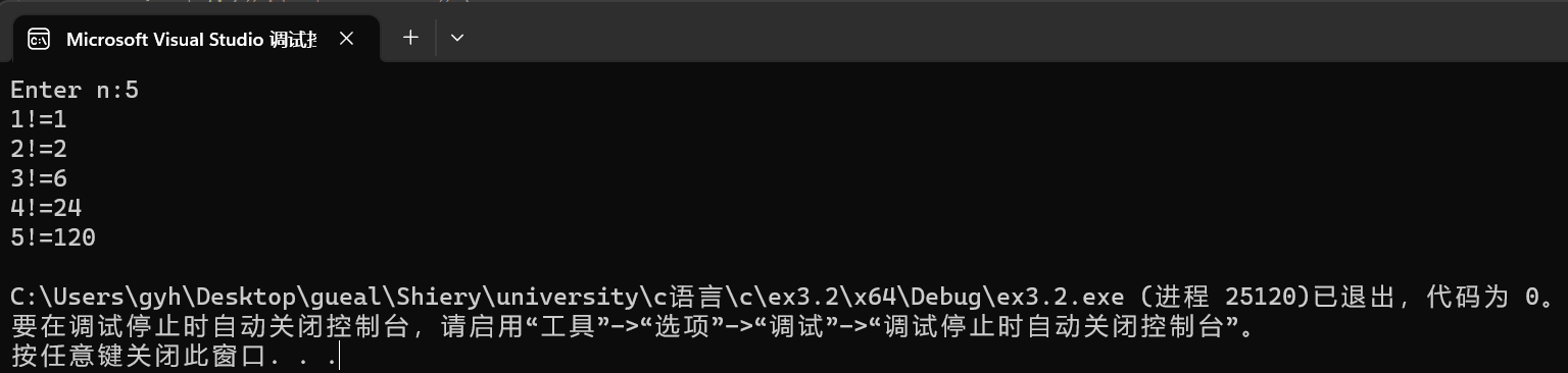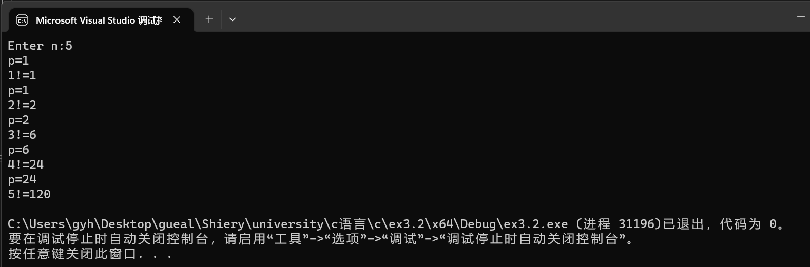 #include<stdio.h> long long fac(int n); int main() { int i, n; printf("Enter n:"); scanf_s("%d", &n); for (i = 1; i <= n; ++i) printf("%d!=%lld\n", i, fac(i)); return 0; } long long fac(int n) { static long long p =1; printf("p=%lld\n", p); p = p * n; return p; }