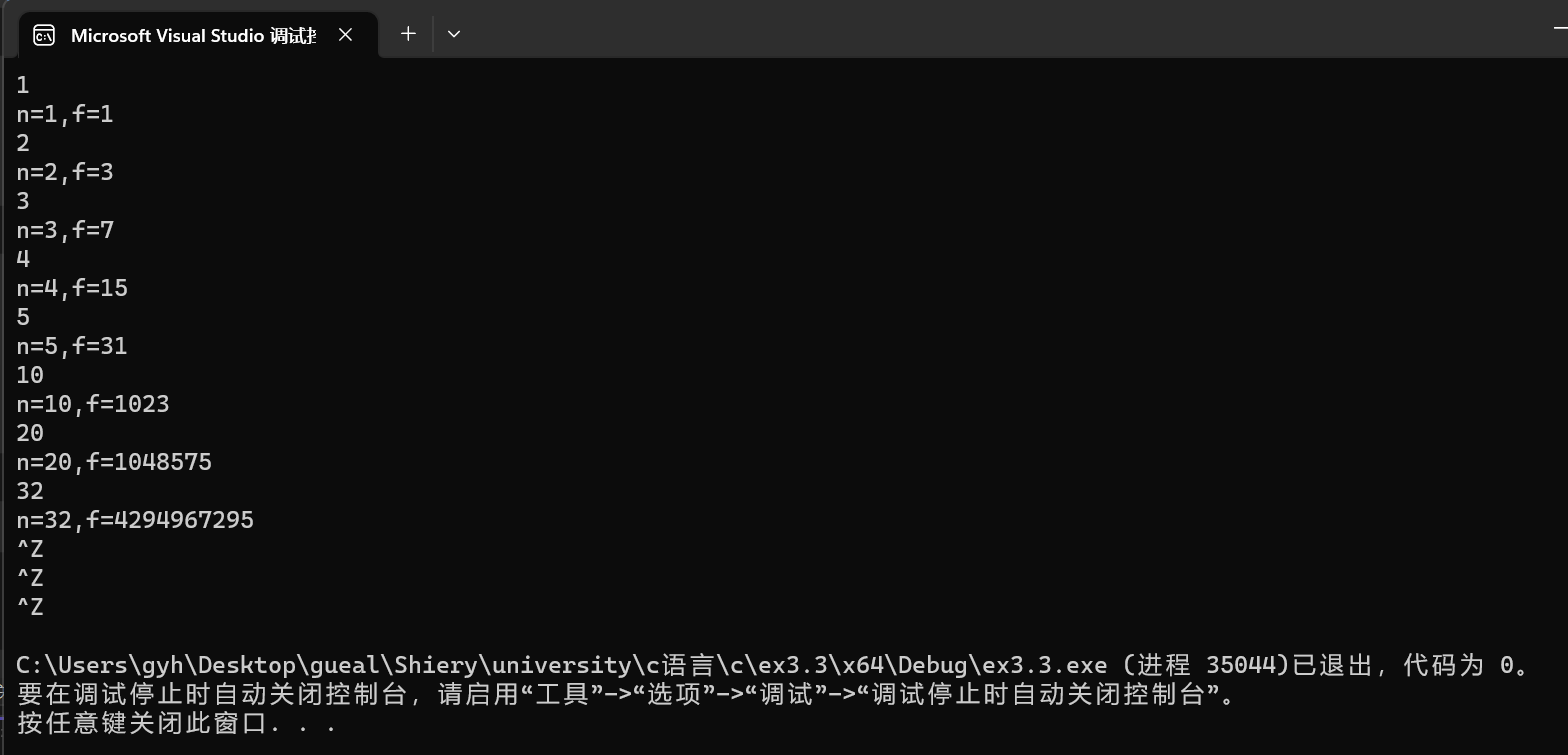 #include<stdio.h> long long func(int n); int main() { int n; long long f; while (scanf_s("%d", &n) != EOF) { f = func(n); printf("n=%d,f=%lld\n", n, f); } return 0; } long long func(int n) { long long f=0; long long m=1; for (int i = 1; i <= n; i++) { m *= 2; f =m-1; } return f; }
