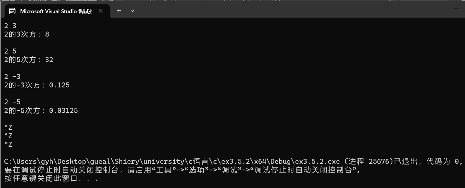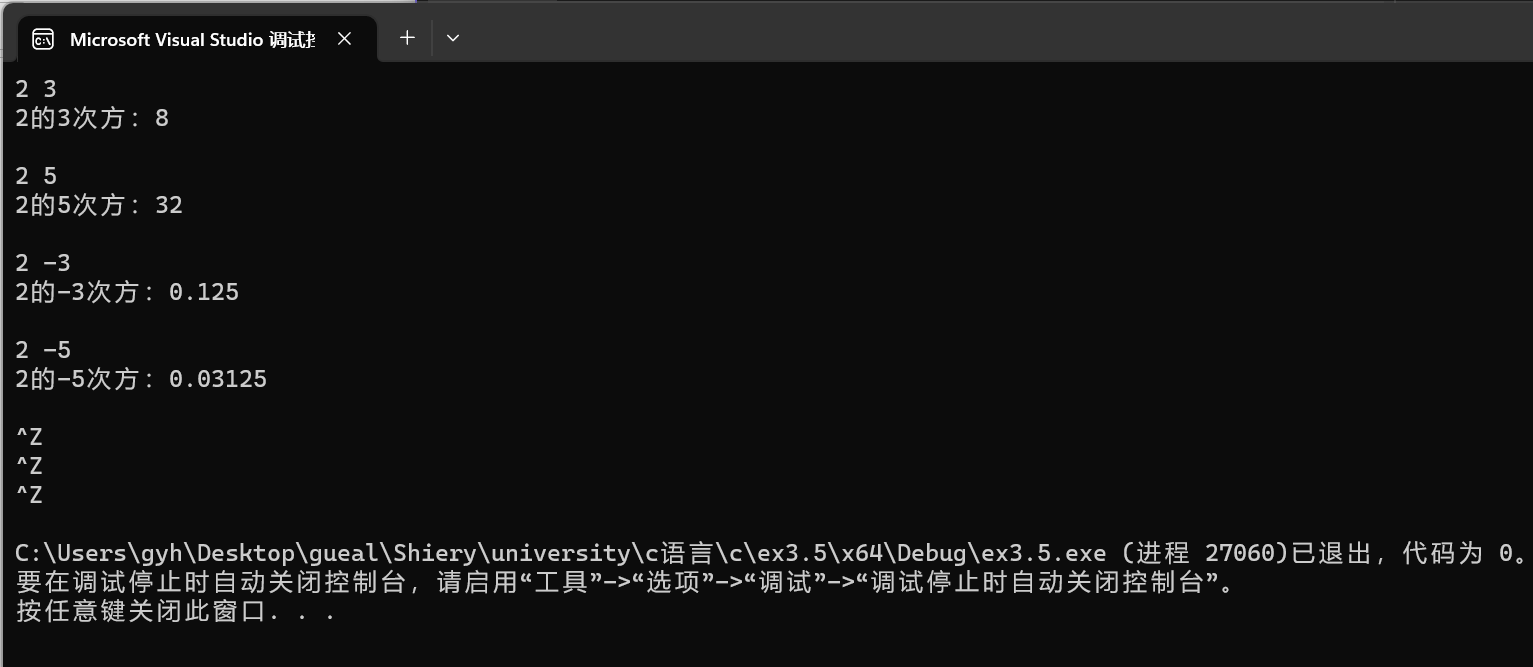 #include<stdio.h> double mypow(int x, int y); int main() { int x, y; double ans; while (scanf_s("%d%d", &x, &y) != EOF) { ans = mypow(x, y); printf("%d的%d次方:%g\n\n", x, y, ans); } return 0; } double mypow(int x, int y) { double ans = 1,t=1; if (y == 0) ans = 1; else { if (y > 0) { for (int i = 1; i <= y - 1; i++) { t *= x; } ans = t * x; } else { for (int j = 1; j <= -y; j++) { t *= x; } ans = 1 / t; } } return ans; }