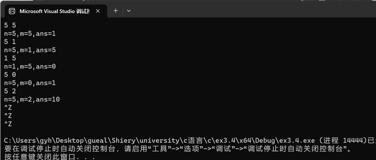 #include<stdio.h> int func(int x, int y); int main() { int n, m; while (scanf_s("%d%d", &n, &m) != EOF) printf("n=%d,m=%d,ans=%d\n", n, m, func(n, m)); return 0; } int func(int x,int y) { double ans; if (y == 0 || y == x) ans = 1; else if (y == 1) ans = x; else if (y > x) ans = 0; else ans = (func(x - 1, y) + func(x - 1, y - 1)); return ans; }