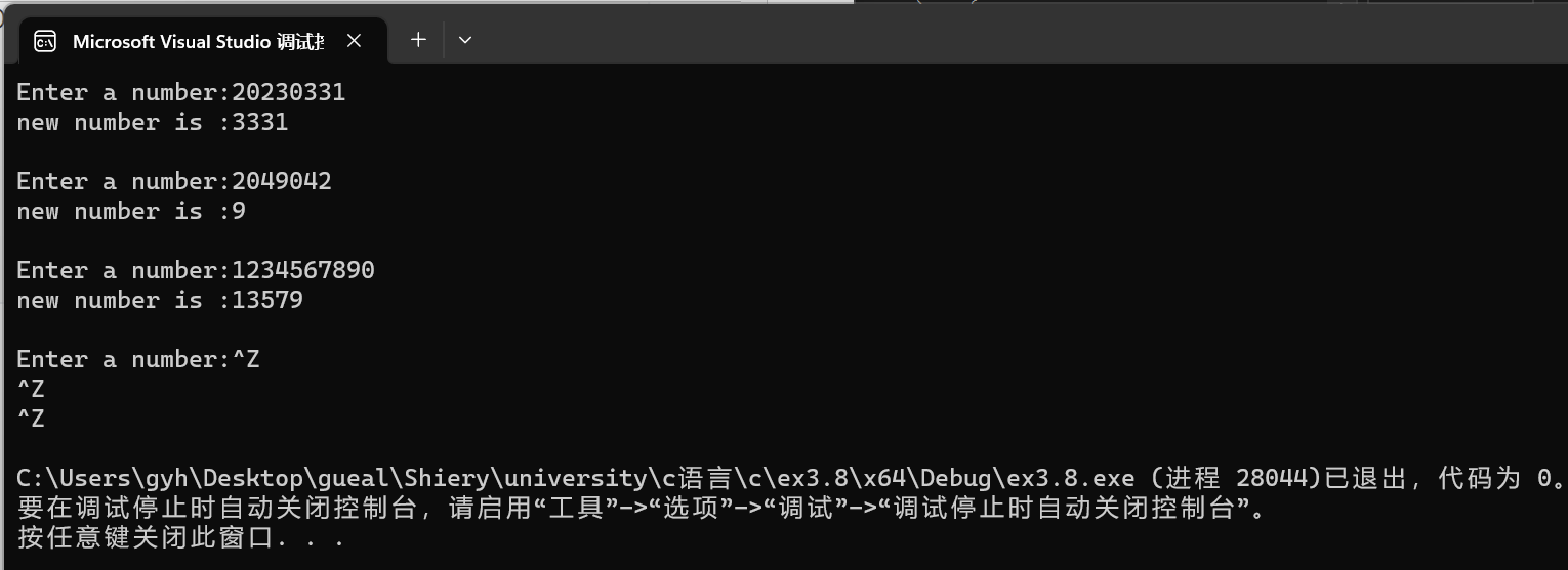 #include<stdio.h> #include<math.h> long func(long s); int main() { long s, t; printf("Enter a number:"); while (scanf_s("%ld", &s) != EOF) { t = func(s); printf("new number is :%ld\n\n", t); printf("Enter a number:"); } return 0; } long func(long s) { long t = 0; int x, sum = 0; while (s) { x = s % 10; if (x % 2 == 1) { sum += 1; t += x * pow(10, sum-1); } s /= 10; } return t; }