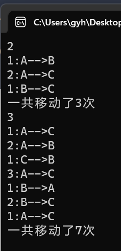 #include<stdio.h> #include<stdlib.h> void hanoi(unsigned int n, char from, char temp, char to); void moveplate(unsigned int n, char from, char to); int tot; int main() { unsigned int n; while (scanf_s("%u", &n) != EOF) { tot = 0; hanoi(n, 'A', 'B', 'C'); printf("一共移动了%d次\n", tot); } system("pause"); return 0; } void hanoi(unsigned int n, char from, char temp,char to){ if (n == 1) moveplate(n, from, to); else { hanoi(n - 1, from, to, temp); moveplate(n, from, to); hanoi(n - 1, temp, from, to); } } void moveplate(unsigned int n, char from, char to) { tot++; printf("%u:%c-->%c\n", n, from, to); }