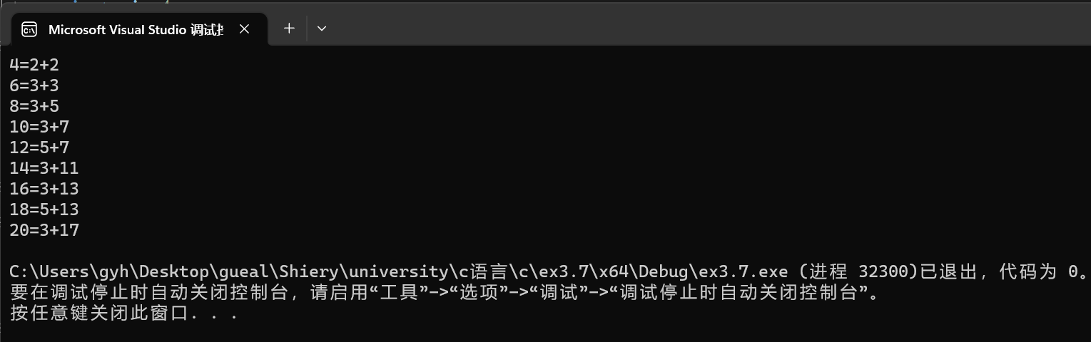 #include<stdio.h> int is_prime(int n); int main() { int i=4; while( i<=20){ int x, y; if (i == 4) printf("4=2+2\n"); else{ for (x = 3; x <= i; x += 2) { y = i - x; if (is_prime(x) && is_prime(y)) { printf("%d=%d+%d\n", i,x,y); break; } } } i += 2; } return 0; } int is_prime(int n) { int i; if (n <= 2) return 0; else { for (i = 2; i <= n - 1; i++) { if (n % i == 0) break; } if (i >= n) return 1; else return 0; } }