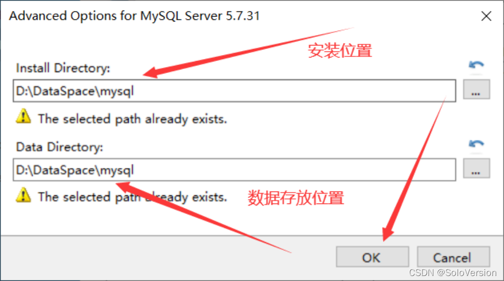 4. 自定义安装路径和数据存放路径,更改完成之后点击“OK”