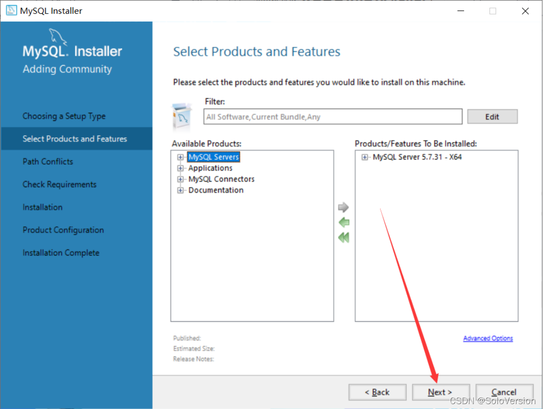 依次点开“MySQL Servers”、“MySQL Servers”、“MySQL Servers 5.7”、“MySQL Servers 5.7.31 -64”,然后点击绿色箭头将选中的版本移植到右边选中框中
